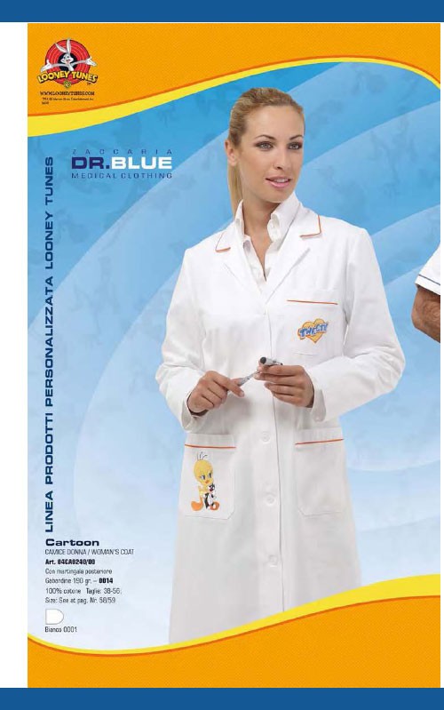 Adatto a medici, dentisti, veterinari, operatori sanitari in genere, ma anche a chi opera in centri estetici. Il catalogo Dr.Blue propone un’ampia scelta di casacche, pantaloni e camici per uomo, donna e unisex. La linea si completa con una serie di capi personalizzati con personaggi Looney Tunes, destinati a chi lavora con i bambini: medici, infermieri e operatori sanitari di studi pediatrici e dentistici.