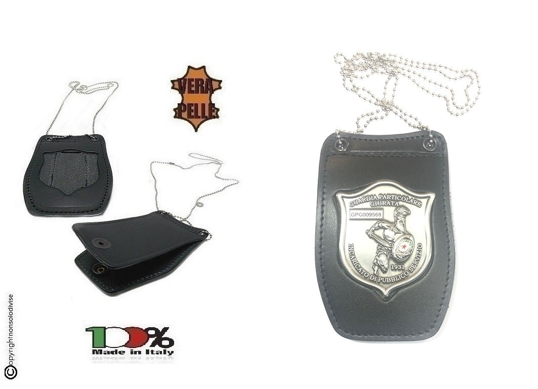 - realizzato in cuoio con catenella in metallo, possibilità di aggancio alla cintura tramite passante. Specifico per placca GPG IPS Prodotto Italiano Supporto Vega Holster Placca Metallo a marchi Registrato a Rilievo 3D Placca Senza Clip Fissa cm 5.50x6.20
