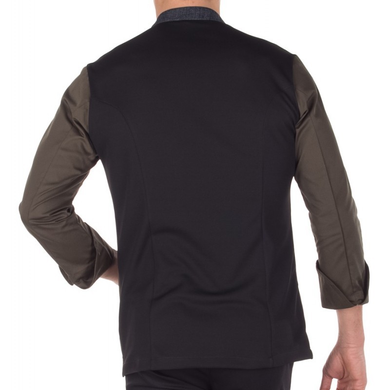 Giacca da cuoco con taglio sartoriale e vestibilità moderna aderente in colore verde militare con rifiniture in jeans grigio su colletto e taschino. Comfort e libertà di movimento sono assicurati grazie alla schiena in rete elastica e traspirante nera. Bottoni automatici in metallo sagomato, tasca al petto e taschino sulla manica sinistra. Tessuto in 65% poliestere - 35% cotone con ottima tenuta alle macchie e durata nel tempo.